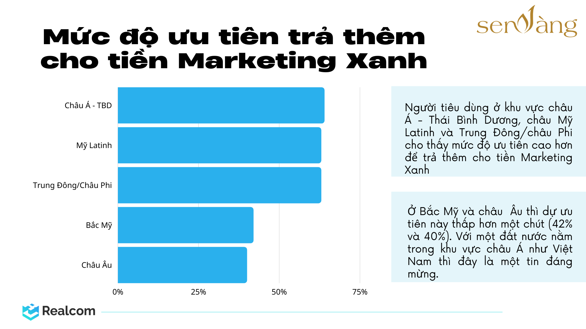 Người tiêu dùng ở khu vực châu Á – Thái Bình Dương, châu Mỹ Latinh và Trung Đông/châu Phi cho thấy mức độ ưu tiên cao hơn để trả thêm cho tiền Marketing Xanh, trong khi ở Bắc Mỹ và châu Âu thì dự ưu tiên này thấp hơn một chút (42% và 40%). Với một đất nước nằm trong khu vực châu Á như Việt Nam thì đây là một tin đáng mừng.