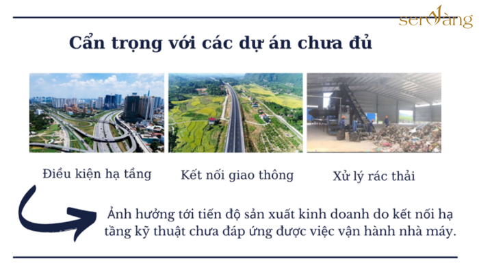 Điều thứ tư được chuyên gia chia sẻ thêm đó là “Cẩn trọng với các dự án chưa đủ điều kiện hạ tầng, kết nối giao thông, công trình xử lý nước thải chưa đáp ứng được sản xuất. Đầu tư tại các dự án này sẽ rất dễ bị ảnh hưởng tới tiến độ sản xuất kinh doanh khi mà kết nối hạ tầng kỹ thuật chưa đáp ứng được việc vận hành nhà máy.”