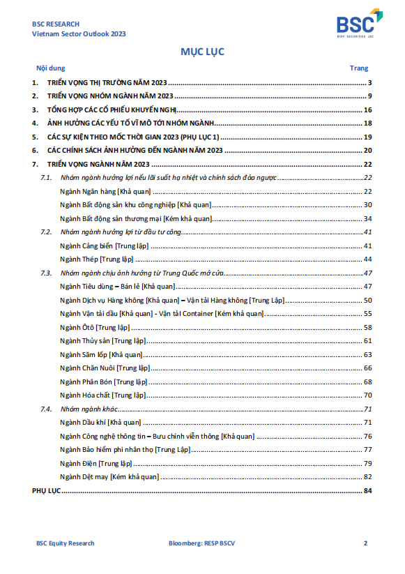 Trong năm 2023, những cơn gió ngược chiều bao gồm (1) Áp lực lạm phát tăng lên, (2) Hoạt động xuất nhập khẩu chậm dần, (3) Môi trường lãi suất ở mức cao, (4) Rủi ro từ thị trường trái phiếu doanh nghiệp và bất động sản sẽ tạo ra thách thức cho mục tiêu hoàn thành kế hoạch tăng trưởng kinh tế. Tuy nhiên, chúng ta vẫn thấy một số yếu tố tích cực đan xen có thể bù trừ cho các yếu tố bất lợi trên như (1) Tỷ giá duy trì mức ổn định, (2) Trung Quốc mở cửa, và (3) Đẩy mạnh giải ngân đầu tư công. Do đó BSC cho rằng các chỉ tiêu kinh tế hiện tại của Việt Nam cho thấy chúng ta vẫn đang ở trong giai đoạn GIẢM TỐC, điển hình bởi đa số các dấu hiệu như lạm phát bắt đầu tăng, lãi suất huy động đã tăng và duy trì mức cao, giá cổ phiếu vẫn trong giai đoạn điều chỉnh. Do đó, việc bước qua giai đoạn phục hồi sẽ cần thêm một số yếu tố quan trọng bổ sung bao gồm (1) Lãi suất huy động và cho vay cần tạo đỉnh và hạ nhiệt, (2) Lạm phát tạo đỉnh và giảm lại và (3) Giá cổ phiếu hình thành xu hướng tăng bền vững.
